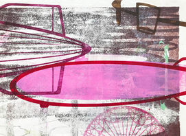 Ik droom ervan om in deze prachtige vormen op reis te gaan. Hun ontwerp fascineert me: het industriële constructie, de ritmische herhaling, de spanning tussen massa en elegantie. Zwaar én licht tegelijk. Die vormen nodigen uit tot spel. Ik spiegel ze, draai ze, vergroot, verklein. Ik herhaal ze tot ze een eigen dynamiek krijgen. En dan kleur ik ze in, met de mooiste combinaties die ik me kan voorstellen. In mijn werk verenigt zich het verlangen naar reizen met de schoonheid van techniek; vorm wordt verhaal.